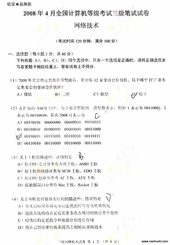 2008年4月计算机等考三级网络笔试试题及参考答案