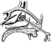 4.对伴有慢性额窦炎、额窦引流不畅,经常出现前额部胀痛症状者,在筛窦切除后,为同时改善额窦引流,可用刮匙刃缘向前下方沿鼻额管将其刮大,或用额窦锉紧贴前壁锉大之(图4)。