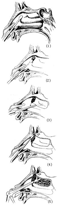 2.如有鼻息肉,先按鼻息肉手术常规,将其大致摘尽。用浸有外用肾上腺素的棉片或纱条止血,并可使中鼻甲缩小,中鼻道充分暴露。