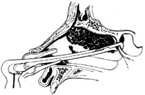 3.以直头的筛窦咬钳咬破筛泡壁,即进入前组筛窦(图2)。因此处骨壁较薄,进入相对容易。一般打开筛房后会有粘脓性分泌物溢出,或串珠状小息肉随之拉出,深部可见开放的筛窦小房,循此缺口向外、下、后方逐步扩大,咬除后组筛窦小房及清除腔内病变组织,直至蝶窦前壁(此时钳子伸入深度为7.5~8cm);换翘头筛窦咬钳,后前、上、外方继续咬除前组筛窦小房。在筛窦切除基本完成后,用不同弯度的刮匙,将术腔内残留的粘膜及骨间隔刮去,使腔宽畅、光滑、平整。亦可先用刮匙自鼻丘部,刃口向外徐徐加压,压破骨壁进入筛房,自前向后逐步刮除筛窦(图3),再配合用咬钳修去残留组织及骨片。如中鼻甲息肉变明显,影响筛泡区暴露,可先适当切除中鼻甲前端,以方便手术进行。如果手术完成较彻底,充分止血后,应在中鼻甲外侧出现一尖端向前、底在后,扁狭的锥体形骨性空腔,骨壁光滑而呈乳白色。