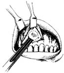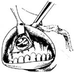 6.清理窦腔 在凿、咬前壁骨质时,往往连同去除粘膜,窦腔已开放。如粘膜仍完整,可予以切开,用吸引器吸去窦内脓血、分泌物等,观察窦内病变性质及范围,以决定下一步处理方针。如为息肉、囊肿或出血坏死组织,可用中隔剥离器将其剥离后,用环形组织钳取出(图5);如窦腔粘膜仅为充血、肥厚,表面尚光滑,则一般都应予以保留,因在手术改善引流,消除炎症后有可能恢复正常,不要轻易决定全部彻底刮除;如窦内充满菜花样新生物,估计恶性肿瘤可能较大,则取数块活检组织后,即可关闭术腔,待病理检查明确诊断后再作处置;如粘膜病变严重,无法保留,则可用剥离器及刮匙细心剥离,彻底去除之。注意在剥离顶壁,即眼眶下壁粘膜时,用力勿过大,以免引起眶底骨折;剥离底壁时,不要刮得太深,以免牙齿根尖暴露而引起术后牙痛。在窦腔清理完毕后,用消毒生理盐水冲洗术腔,再将干纱条或浸以外用肾上腺素溶液纱条填入窦腔,置留片刻,使腔内干净,无活动出血,取出纱条后仔细检查窦内各骨壁是否完整,有否病变组织残留。如有,则去除之。