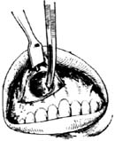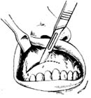 3.切口 用拉钩向上翻起上唇,距唇龈沟上约0.5cm处,自尖牙嵴至第二双尖牙以圆头刀片作长约2~2.5cm横切口,刀刃应与粘膜面垂直、一刀连贯切开粘膜、骨膜,直达骨质(图1)。为防止损伤唇角,可先用棉片将刀片后部裹住,仅露出前端,这样使用较为安全。