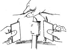 需用刀刃长、薄而锋利的切皮刀一把,木板两块。取皮时,供皮区皮面保持平坦和紧张。术者右手持刀,左手拿木板压在供皮区上,另一助手以木板朝相反方向牵张皮肤,并握紧供皮区对侧的皮肤。然后用刀切入皮层,往往返拉锯动作,即可将所需皮片切下。皮片的厚度视刀刃与皮面间的角度而定,角度愈大则皮片愈厚(图1)。