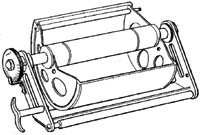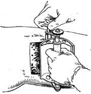 2.机械取皮 用切皮机(图2)取皮较为平整,厚度均匀,边缘整齐。皮片厚度以1‰时为单位(注:为适于临床操作而保留本单位),切皮机上的刻度盘1格为5‰时。一般表皮皮片为8‰-10‰时,薄的中厚度片12‰-20‰时,厚的中厚皮片22‰-30‰时。切片时先在鼓面和皮面上涂胶水以粘住皮肤,其范围视所需皮片的大小而定。术者左手握机柄,右手持刀架,将鼓面前缘先与供皮区接触,轻压后再向上翻转,此时皮肤被粘起成皱襞状,将刀切入皮层,并将鼓面不断向上翻起,拉动刀架,即可切割至所需大小的面积(图3)。