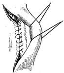 在预定供皮部位,作长轴与主要血管走向一致的两条平行切口,由一侧切口向对侧贴近筋膜表面剥离,直至对侧切口,形成一皮肤条带。严密止血,缝制成皮管(图4)。供皮区的创缘广泛游离,减少伤口张力后缝合。皮管的长度与宽度之比不宜超过2.5~3∶1,否则不易存活。皮管形成后要注意血运情况,勿使蒂部扭转,以免引起坏死。皮管形成3~4周后,经过移转,再经3~4周后,切断蒂部。断蒂前用细橡皮筋束于蒂部作夹压训练,暂时阻断血运,防止因血运突然减少而影响存活。