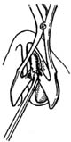 ⑴切口稍长,以便置入自动拉钩(由乳突术张开器改制,向上一侧拉钩齿改为长4cm、宽2cm的弧形金属薄板。