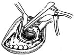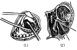 ⑵上颌窦前壁尖牙窝部位骨质不是用凿凿去,而由装有特制直径1.2cm环形带齿之圆钻头的手摇钻取出骨片保留,以备手术结束前重新置入。