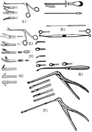 ⑴鼻剪 ⑵鼻骨剪 ⑶筛窦钳 ⑷倒向开口切割打孔器 ⑸穿刺导管针及吸引管 ⑹筛窦刮匙、镰状刀 ⑺筛窦咬骨钳