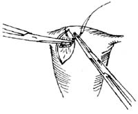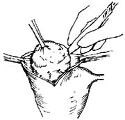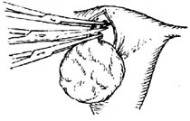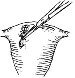 5.浆膜下肌瘤切除 此类肌瘤常带蒂,可贴近子宫壁夹住瘤蒂,切除肌瘤(图8)。瘤蒂较宽时,可在基底部做一梭形切口(图9),切除肌瘤及子宫瘤蒂部的浅肌层。