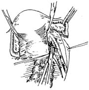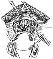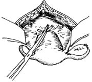 对宫颈巨大肌瘤,可先打开阔韧带后叶,找到输尿管,必要时切开输尿管隧道,游离输尿管,再作肌瘤剔除(图14)。