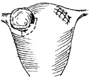 6.粘膜下肌瘤切除 若肌瘤明显突入宫腔,需进入宫腔内切除肿瘤,缝合肌层时,应避开粘膜层,以免内膜植入肌层,人为造成子宫内膜异位。对带蒂的粘膜下肌瘤,可经阴道进行切除。