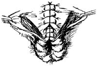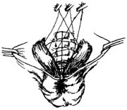 6.缝合肛门括约肌 在直肠两侧凹陷处钳夹肛门括约肌断端,向中线拉拢,行“8”字缝合(图5)。