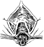 2.切口 沿瘘孔瘢痕外侧缘作瘘孔形同的切口。对大瘘孔需做从瘘孔下缘至肛门正中的切口(图1)。