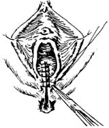 10.缝合阴道壁 阴道壁行间断缝合,至处女膜痕对合处(图8)。
