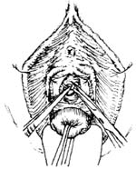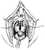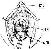 2.暴露术野 将小阴唇缝合固定在大阴唇外侧皮肤上,以阴道拉钩暴露瘘孔,用宫颈钳牵引宫颈,用金属导尿管探查瘘孔,了解其大小、部位、数目及有无瘢痕(图3)。