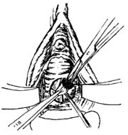 3.分离瘘孔 沿瘘孔边缘切开膀胱壁,在膀胱壁和阴道壁之间作潜行分离,距瘘孔缘约2cm(图15)。