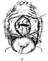 2.手术操作 对高位、较大的瘘孔,先从阴道分离瘘孔下缘(参考经阴道膀胱阴道瘘修补术),再从腹部经膀胱分离瘘孔上缘(参考经腹部膀胱阴道瘘修补术),然后两组同时进行操作,互相配合进行缝合。