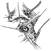 1.切除瘘孔周围的阴道粘膜 距瘘孔边缘约1~2cm,环形切开阴道粘膜,剥离瘘孔周围粘膜至瘘缘切除之(图11)。