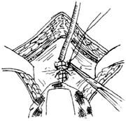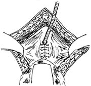 8.膀胱内置尿管 闭合膀胱壁切口前,置双腔导尿管于膀胱内(图21),自下腹壁引出。并在膀胱两侧放置引流条。