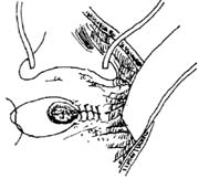 2.暴露瘘孔。瘘孔在膀胱三角区近输尿管入口时,可插入输尿管导管,以确定输尿管膀胱壁,显露瘘孔。瘘孔在膀胱三角区近输尿管入口时,可插入输尿管导管,以确定输尿管位置,避免损伤。在瘘孔左右边缘的膀胱壁处,各缝一针线,便于牵引(图14)。