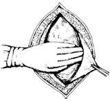 ⑵分离腹壁后间隙(图4):术者用手指沿腹壁切口的左侧缘分离腹壁后间隙。膀胱多随子宫的右旋而偏右,在左侧处较易暴露膀胱,因素手术取左侧入。