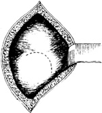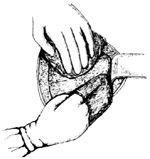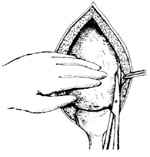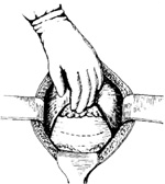 步骤同顶入式,所不同的是用0.5%的普鲁卡因层层注入膀胱腹膜返折之组织间隙内,使膀胱与腹膜间疏松结缔组织膨胀,间隙增宽,用剪刀做锐性分离,要避免损伤血管,减少出血。将膀胱推至返折腹膜以下,充分暴露子宫下段。