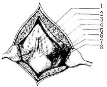 ⑶暴露三角区,分离脂肪堆:术者用右手指沿腹壁切口左侧缘,分离腹壁后间隙,暴露膀胱前壁及左侧窝,腹横筋膜较薄弱,可与下方的脂肪组织一并推开,若腹横筋膜增厚,则剪开之(图5),分离的深度以不超过腹壁下动脉为限。助手用腹壁拉钩提起左侧腹壁切缘,以暴露膀胱左侧之脂肪堆。术者以左手压住膀胱顶部的腹膜,右手将侧窝中的黄色脂肪及结缔组织推向外侧,暴露出腹膜返折(图6,7)。返折的特点是色浅、光滑、发亮,若左手放松压迫,有时可见一到腹水充盈。此三角区的三边由腹壁下动脉、腹膜返折及膀胱侧壁构成。子宫肌壁构成了三角区的底,其表面附着子宫前筋膜。推离脂肪堆,应从近膀胱顶部较高的位置开始,逐步分清通向膀胱较低处的术野,防止损伤输尿管及髂内血管。
