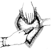 ⑶游离膀胱宫颈间隙:先游离膀胱顶部,牵引筋膜上切缘的血管钳,使筋膜伸展开,术者左手垫纱布压迫固定腹膜,右手示指裹纱布,沿膀胱轻轻向下推膀胱,在脐旁韧带间往返推离2~3次后,膀胱被下推约3~4cm(图21)。