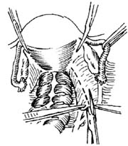 3.子宫广泛切除 高位剪开骨盆漏斗韧带表面的盆腹膜,向前延至圆韧带(图2),向内下方沿输尿管达宫骶韧带(图3)。盆腹膜切线如图4。在髂总动脉水平结扎、切断骨盆漏斗韧带(图5),于圆韧带外1/3切断后缝扎(图6),同法处理另侧。打开膀胱腹膜反折,向下锐性分离膀胱宫颈和膀胱阴道膈(图7)。剪开子宫直肠窝的腹膜反折,向下分离直肠阴道间隙(图8)。切除骶韧带3cm,缝扎残端(图9)。分离输尿管隧道(图10),切断主韧带约2~3cm,缝扎残端(图11)。