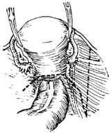 9.阴道引流和堵塞 将阴道残腔尽量缝合止血和缩小。并在腹组配合下,以凡士林纱布敷贴直肠、膀胱下段创面,其中置胶管2条引流。再于凡士林纱布中间加压堵塞碘仿纱自盆底至阴道口,引流胶管、凡士林纱布碘仿纱的外端均在阴道口固定及做好标志(图23、图24)。