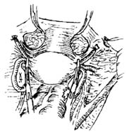 5.处理阴道旁组织 从阴道前、后壁向两侧壁分离,暴露阴道旁尿生殖膈肌、耻骨直肠肌,靠近骨盆切断,直至中上段(图18)。
