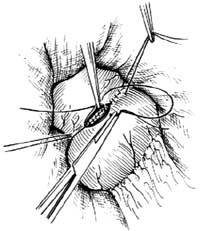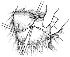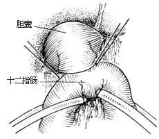 6.胆囊十二指肠吻合 用肠钳控制十二指肠吻合口远端,避免肠液外漏。将胆囊底部与十二指肠上段靠拢,在预定的胆囊底部和十二指肠前壁的吻合口两端用丝线作两针固定牵引线,相距2.5~3cm[图1