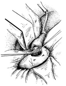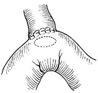 5.吻合 在牵引线之间将胆总管上段纵行切开2~3cm长,吸除胆汁。再在十二指肠球部上缘作一与肠管纵轴平行的切口,长度与胆总管切口相等,随时吸除外溢的肠液。结扎粘膜下出血点[图1
