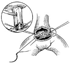 ⑵]。用细丝线在距切缘0.2cm处将吻合口后壁作浆肌层间断缝合(也可不缝),使胆总管切口两侧中点与十二指肠切口两端对拢,而后用4-0~3-0铬制肠线作吻合口后壁内层全层间断缝合。吻合口前壁内层也用铬制肠线作全层间断内翻缝合[图1