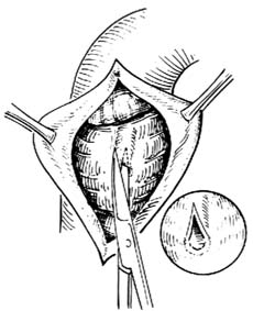 6.括约肌成形 将胆道扩张器置于括约肌乳头处,作为引导。在括约肌与壶腹部的前外侧相当于10点钟位置,先用小刀或小剪作楔形切除,一般切口长度为1.5~2.0cm,底部宽0.3~0.5cm[图1