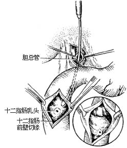 4.切开十二指肠 沿十二指肠降部外侧缘切开后腹膜,分离十二指肠降部。随即用手指在其前壁触膜胆道扩张器的头部,在该区纵行或横行切开约2~3cm,用吸引器吸去十二指肠液,结扎出血点。