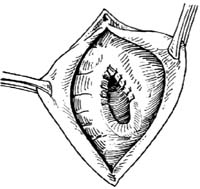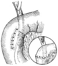 ⑶]。注意切勿在前内侧或内侧作楔形切除,以防损伤胰管。由于切口较长,容易引起出血,应仔细缝扎出血点。然后,用4-0铬制肠线将括约肌切口作全层间断缝合,使十二指肠粘膜与胆总管下端粘膜对合[图1
