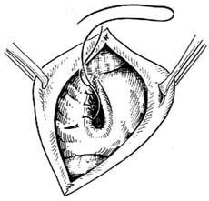 7.缝合十二指肠切口 十二指肠的切口,短的可以横行缝合,长的应沿十二指肠纵轴缝合,以免成角并有张力。内层用丝线作间断全层缝合,线结打在肠腔内,使肠壁内翻;外面用细丝线作浆肌层间断缝合加固。