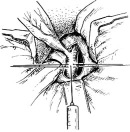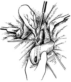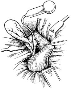 穿刺获胆汁后,必要时可接着作胆道内压力测量;有条件和需要者,可做胆道造影。然后,将牵引线两侧提起,在牵引线中间穿刺针眼处沿胆总管纵轴用尖刃刀作1.5~2cm长切口。先垂直于胆总管壁刺入,但勿太深,以免刺破胆总管后壁或伤及门静脉,再向上、下方扩大切口。同时,助手用吸引器吸除流出的胆汁[图1