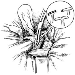 9.引流胆总管 胆总管切开探查后,应自剖口置入引流管,不然,极易发生胆漏等并发症。用质软、弹性强、粗细适宜的t形胶管引流。t形管短臂向肝门段不宜超过1cm,向下不宜超过3cm,以免管端顶在左、右肝管分叉处及下段胆总管壁,引起疼痛、压迫性溃疡、出血或引流不畅等。将短臂两端修剪成斜面,在与长臂相对的短臂管臂上剪一小孔,或将管壁剪除一条,形成沟形,以便日后拔出。有时,可将其底部侧壁剪除一半,开放管腔。修剪妥善的t形管,将短臂折迭,用一长弯止血钳或大摄子夹住,送入胆总管切口内[图1