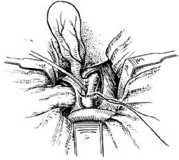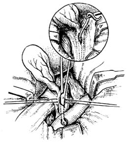 胆总管表面炎性浸润,偶有曲张静脉,甚至呈静脉瘤状,应紧靠胆总管表面,将其缝扎或分离后结扎、切断,以免显露胆总管时损伤出血。