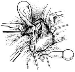 7.扩张胆总管下端 疑胆总管下端有狭窄或阻塞时,需用胆道扩张器扩张。扩张器应略有弧度,使适应胆管下段的弯曲度。一般先用小号扩张器,从胆总管内向下放至相当于括约肌部位后,向前轻巧适当加压,同时用另一手放在十二指肠前壁扪诊,确定扩张器末端是否进入十二指肠[图1