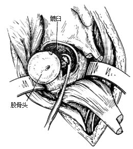 ⑶脱位股骨头,凿除头、臼关节软骨面