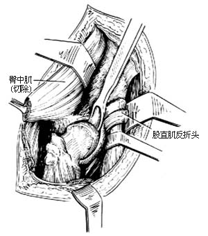 ⑵从大转子上切下臀中肌止点后向外拉开,向内拉开股直肌,用髋臼凿插进髋关节进行分离