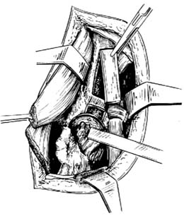 ⑵]。在切除后侧关节囊的病灶时,因位置较深,显露较小,应仔细操作,不能切除过深,以免损伤深部的坐骨神经。如切除有困难,可用刮匙刮尽肉芽或切除部分滑膜[图1