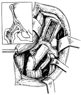 ⑷复位后,矢状面劈开大转子,在髋臼上缘凿槽,凿毛股骨颈上面,从髂骨取植骨片