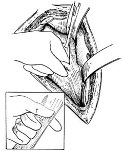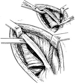 ⑴])。如存有巨大腰大肌脓肿,切开腰肌筋膜向下延长切口,特别是采用t形切口时尤应注意避免损伤神经。预防方法是:切开腰肌筋膜前,先在选点切口周围用针穿刺,观察股四头肌有无收缩,如无收缩,可于该点作一条1cm长的切口,经孔伸入示指,协同拇指检查脓肿壁中有无索状物。扩大切口时,应避开索状物。若无索状物,也不要作锐性切开,宜用手指慢慢分开。万一不慎损伤神经,应即行吻合术修复。