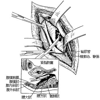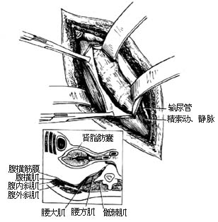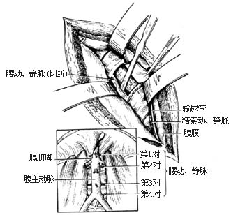 ⑷切开前纵韧带,结扎腰动、静脉(附图示腰动、静脉位置)