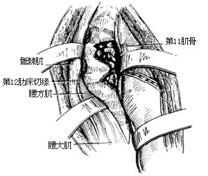 ⑶切开背阔肌、下后锯肌,显露第12肋骨