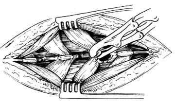3.显露椎板时,须用多块纱布堵塞止血,当纱布为血液浸透粘在肌肉上时,容易被误认为肌肉而遗漏在伤口内,应特别注意预防。每块纱布必须在切口外露出纱布头,并须计数。